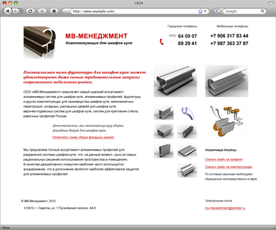 Компания МВ-Менеджмент предлагает самый широкий ассортимент алюминиевых систем для шкафов купе, алюминиевых профилей и фурнитуры. Для поиска новых клиентов и удобства существующих был создан промо-сайт на котором размещена информация о компании и последнии прайс-листы компании.